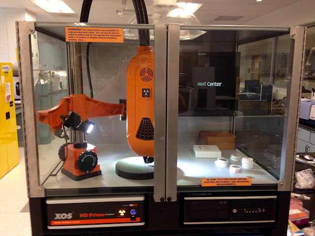 Above is a picture of the X-Ray Fluorescent (XRF) also known as the HD Prime. We use this machine along with the SEM to help us identify elements in our samples. The XRF identifies more elements than the SEM, and is beneficial for our research. A vacuum is needed over the HD Prime when operating because it releases radioactive material gases that need to be sucked out of the room to protect the operator from potentially dangerous gases. CAUTION: It releases x-rays.